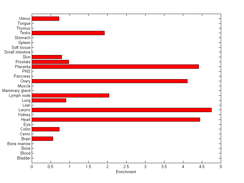 The expression level is normalized with tissue-library size. Each value for a gene in a tissue is a ratio of observed ESTs to the expected one in this tissue. The expected number of ESTs is the product of total ESTs of the gene and the fraction of total ESTs in the tissue among all ESTs in 30 tissues.