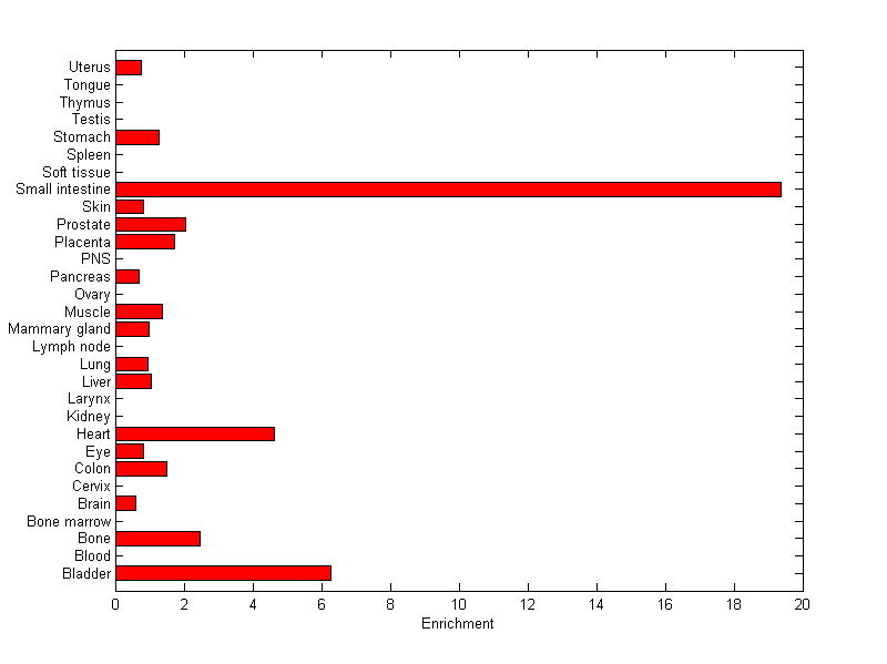 The expression level is normalized with tissue-library size. Each value for a gene in a tissue is a ratio of observed ESTs to the expected one in this tissue. The expected number of ESTs is the product of total ESTs of the gene and the fraction of total ESTs in the tissue among all ESTs in 30 tissues.