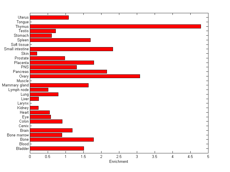 The expression level is normalized with tissue-library size. Each value for a gene in a tissue is a ratio of observed ESTs to the expected one in this tissue. The expected number of ESTs is the product of total ESTs of the gene and the fraction of total ESTs in the tissue among all ESTs in 30 tissues.