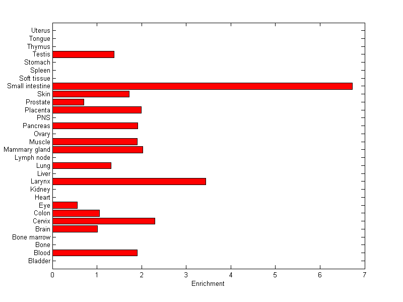 The expression level is normalized with tissue-library size. Each value for a gene in a tissue is a ratio of observed ESTs to the expected one in this tissue. The expected number of ESTs is the product of total ESTs of the gene and the fraction of total ESTs in the tissue among all ESTs in 30 tissues.