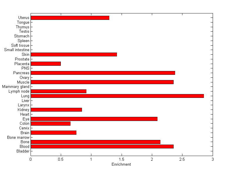 The expression level is normalized with tissue-library size. Each value for a gene in a tissue is a ratio of observed ESTs to the expected one in this tissue. The expected number of ESTs is the product of total ESTs of the gene and the fraction of total ESTs in the tissue among all ESTs in 30 tissues.