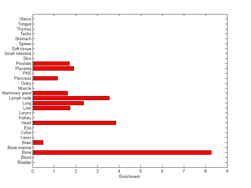 The expression level is normalized with tissue-library size. Each value for a gene in a tissue is a ratio of observed ESTs to the expected one in this tissue. The expected number of ESTs is the product of total ESTs of the gene and the fraction of total ESTs in the tissue among all ESTs in 30 tissues.