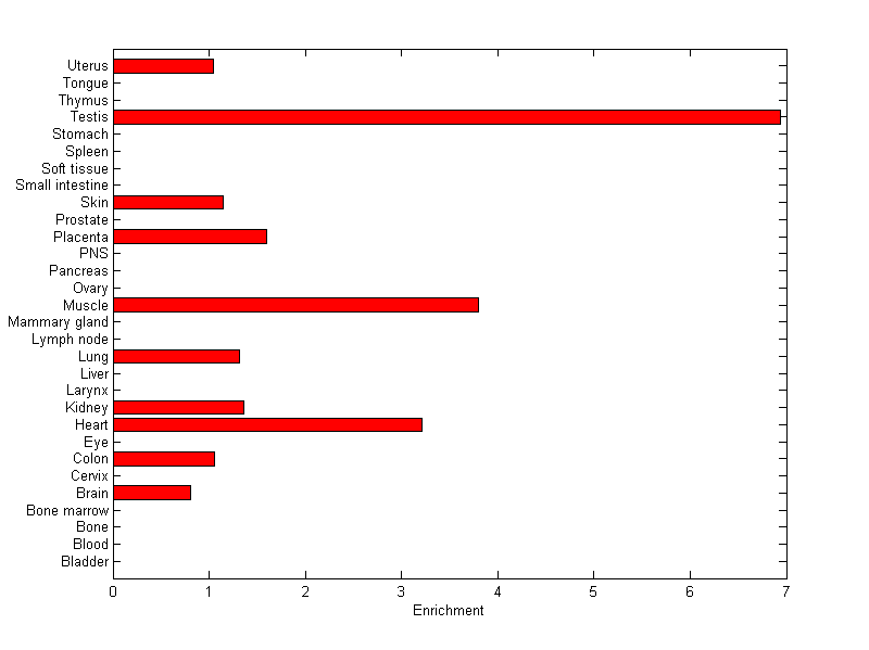 The expression level is normalized with tissue-library size. Each value for a gene in a tissue is a ratio of observed ESTs to the expected one in this tissue. The expected number of ESTs is the product of total ESTs of the gene and the fraction of total ESTs in the tissue among all ESTs in 30 tissues.
