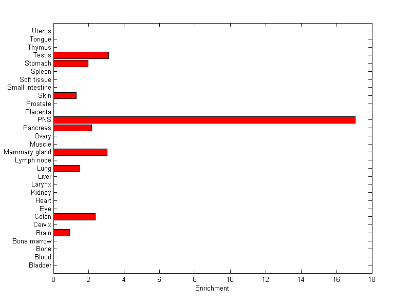 The expression level is normalized with tissue-library size. Each value for a gene in a tissue is a ratio of observed ESTs to the expected one in this tissue. The expected number of ESTs is the product of total ESTs of the gene and the fraction of total ESTs in the tissue among all ESTs in 30 tissues.