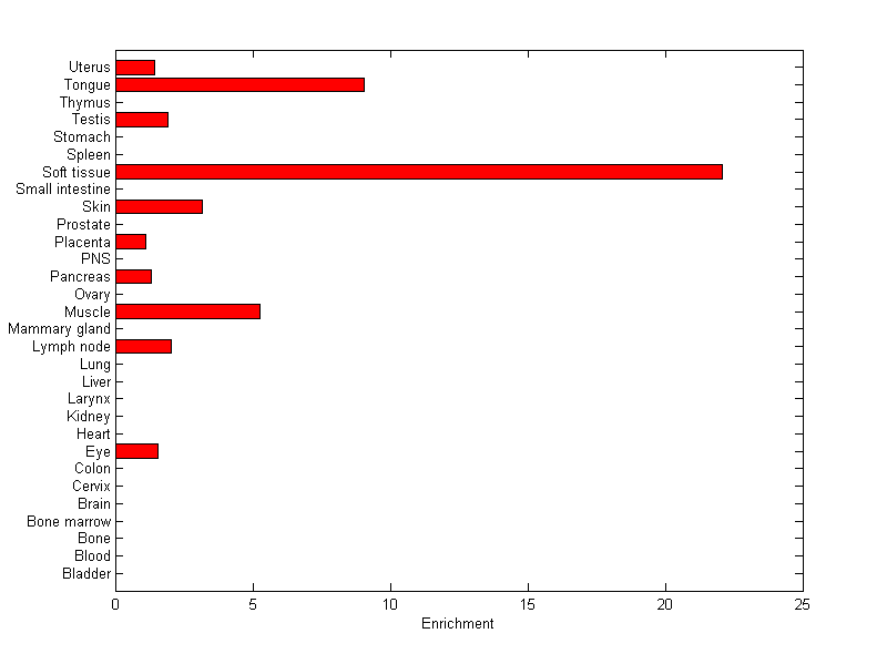 The expression level is normalized with tissue-library size. Each value for a gene in a tissue is a ratio of observed ESTs to the expected one in this tissue. The expected number of ESTs is the product of total ESTs of the gene and the fraction of total ESTs in the tissue among all ESTs in 30 tissues.
