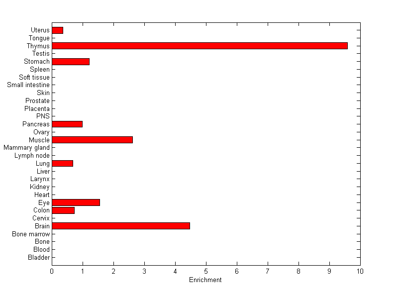 The expression level is normalized with tissue-library size. Each value for a gene in a tissue is a ratio of observed ESTs to the expected one in this tissue. The expected number of ESTs is the product of total ESTs of the gene and the fraction of total ESTs in the tissue among all ESTs in 30 tissues.