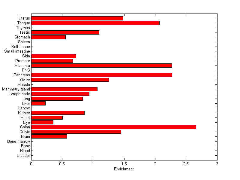 The expression level is normalized with tissue-library size. Each value for a gene in a tissue is a ratio of observed ESTs to the expected one in this tissue. The expected number of ESTs is the product of total ESTs of the gene and the fraction of total ESTs in the tissue among all ESTs in 30 tissues.