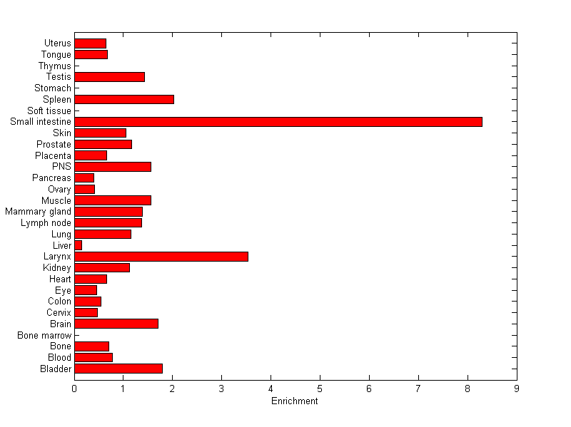 The expression level is normalized with tissue-library size. Each value for a gene in a tissue is a ratio of observed ESTs to the expected one in this tissue. The expected number of ESTs is the product of total ESTs of the gene and the fraction of total ESTs in the tissue among all ESTs in 30 tissues.