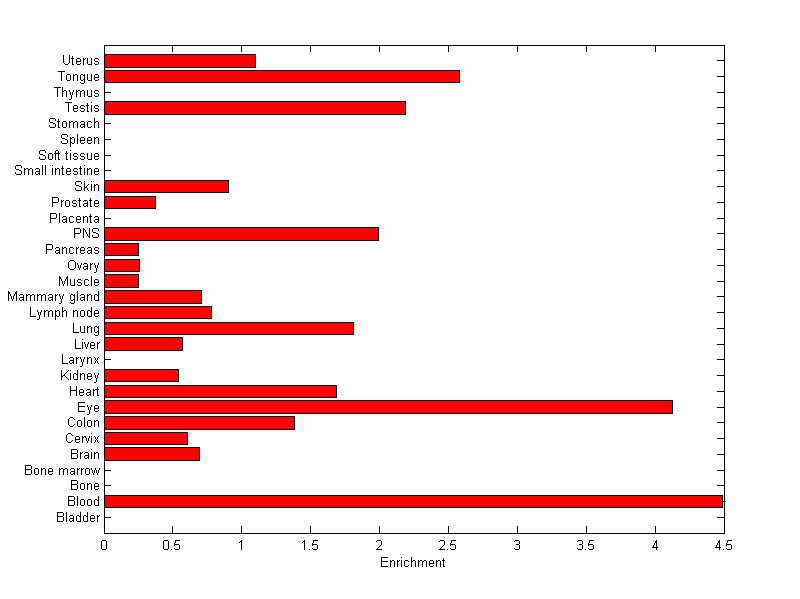The expression level is normalized with tissue-library size. Each value for a gene in a tissue is a ratio of observed ESTs to the expected one in this tissue. The expected number of ESTs is the product of total ESTs of the gene and the fraction of total ESTs in the tissue among all ESTs in 30 tissues.