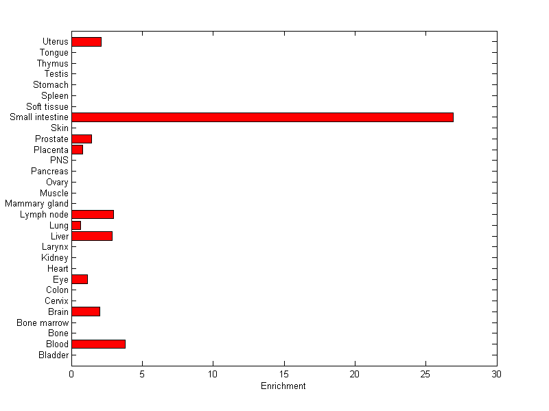 The expression level is normalized with tissue-library size. Each value for a gene in a tissue is a ratio of observed ESTs to the expected one in this tissue. The expected number of ESTs is the product of total ESTs of the gene and the fraction of total ESTs in the tissue among all ESTs in 30 tissues.
