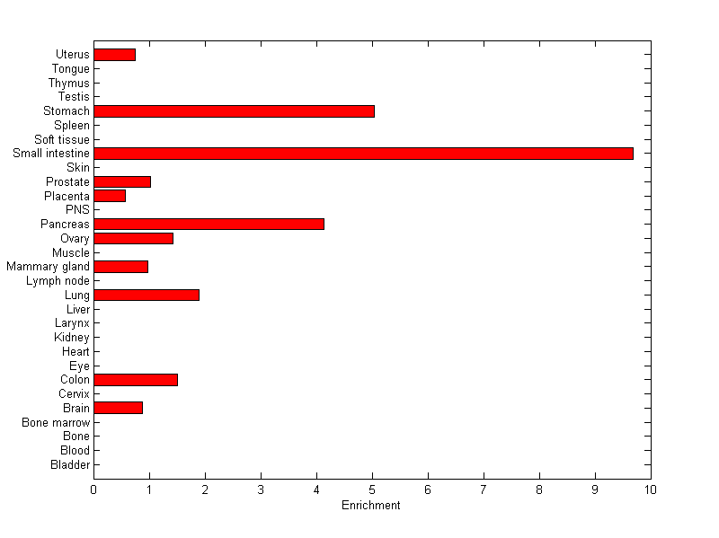 The expression level is normalized with tissue-library size. Each value for a gene in a tissue is a ratio of observed ESTs to the expected one in this tissue. The expected number of ESTs is the product of total ESTs of the gene and the fraction of total ESTs in the tissue among all ESTs in 30 tissues.