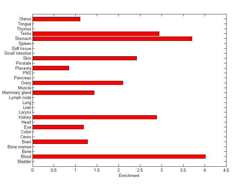 The expression level is normalized with tissue-library size. Each value for a gene in a tissue is a ratio of observed ESTs to the expected one in this tissue. The expected number of ESTs is the product of total ESTs of the gene and the fraction of total ESTs in the tissue among all ESTs in 30 tissues.