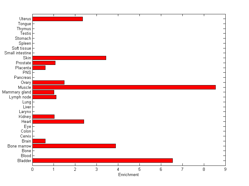 The expression level is normalized with tissue-library size. Each value for a gene in a tissue is a ratio of observed ESTs to the expected one in this tissue. The expected number of ESTs is the product of total ESTs of the gene and the fraction of total ESTs in the tissue among all ESTs in 30 tissues.