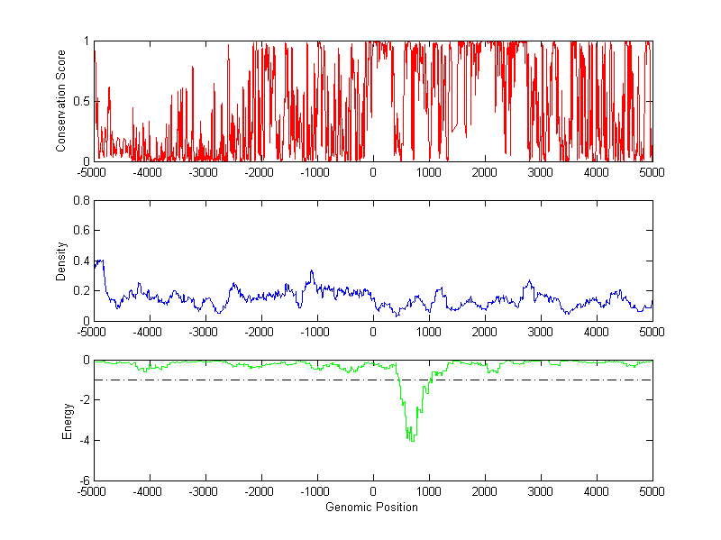 About the profiles: The conservation profile (red curve) is about conservation scores of the promoter sequences. Conservation was determined from an eight-way alignment of human, chimpanzee, dog, mouse, rat, chicken, zebrafish and fugu sequences. The conservation was quantified by a conservation score between 0 and 1, with 1 as highest conservation. The conservation score was obtained from UCSC genome databases. The density profile (blue curve) is about density of all TF binding sites. The energy profile (green curve) is about energy for module detection based on TF interaction. The positions with energy less than -1 indicate the existence of CRMs. Download: Conservation profileDensity profile Energy profile CRM summary |