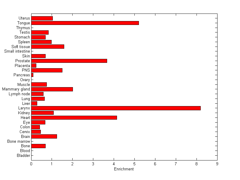 About the profile: The expression level is normalized with tissue-library size. Each value for a gene in a tissue is a ratio of observed ESTs to the expected one in this tissue. The expected number of ESTs is the product of total ESTs of the gene and the fraction of total ESTs in the tissue among all ESTs in 30 tissues. Summary: This gene is preferentially expressed in [larynx, tongue] Download: |