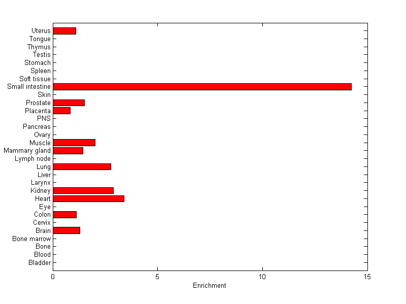 The expression level is normalized with tissue-library size. Each value for a gene in a tissue is a ratio of observed ESTs to the expected one in this tissue. The expected number of ESTs is the product of total ESTs of the gene and the fraction of total ESTs in the tissue among all ESTs in 30 tissues.