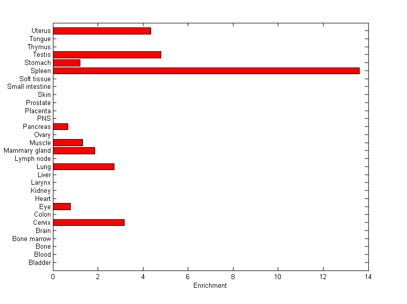The expression level is normalized with tissue-library size. Each value for a gene in a tissue is a ratio of observed ESTs to the expected one in this tissue. The expected number of ESTs is the product of total ESTs of the gene and the fraction of total ESTs in the tissue among all ESTs in 30 tissues.