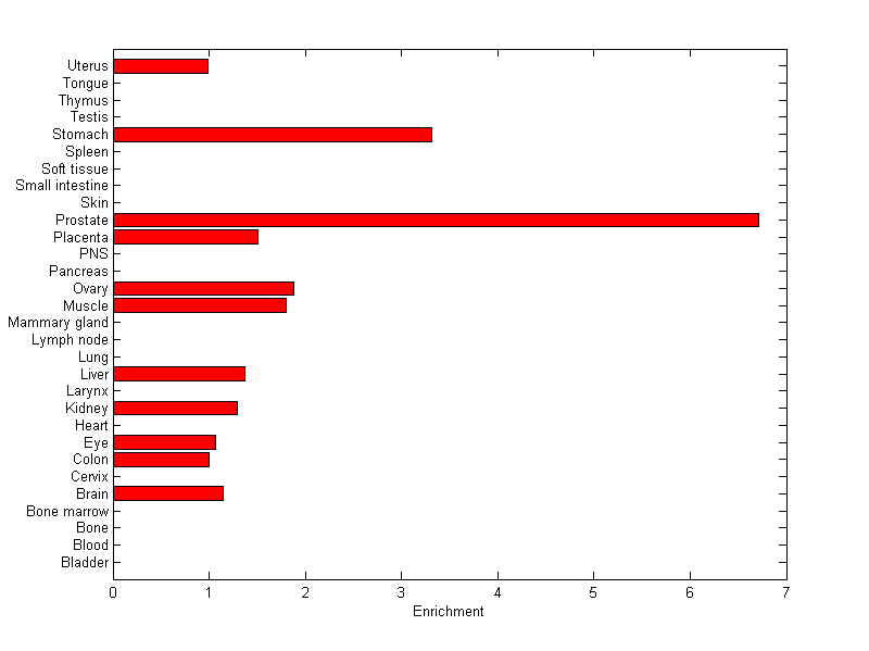 The expression level is normalized with tissue-library size. Each value for a gene in a tissue is a ratio of observed ESTs to the expected one in this tissue. The expected number of ESTs is the product of total ESTs of the gene and the fraction of total ESTs in the tissue among all ESTs in 30 tissues.