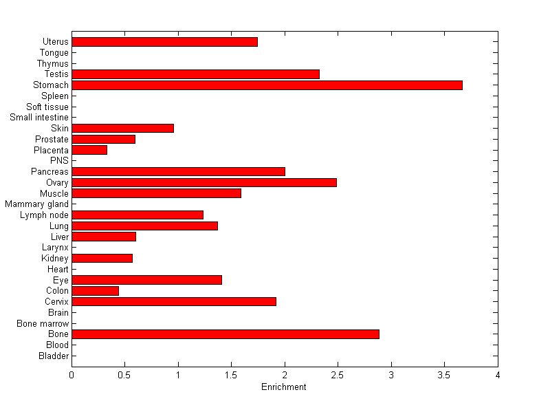 The expression level is normalized with tissue-library size. Each value for a gene in a tissue is a ratio of observed ESTs to the expected one in this tissue. The expected number of ESTs is the product of total ESTs of the gene and the fraction of total ESTs in the tissue among all ESTs in 30 tissues.