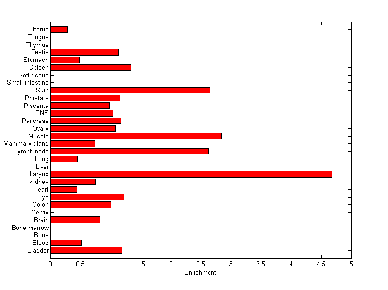 The expression level is normalized with tissue-library size. Each value for a gene in a tissue is a ratio of observed ESTs to the expected one in this tissue. The expected number of ESTs is the product of total ESTs of the gene and the fraction of total ESTs in the tissue among all ESTs in 30 tissues.