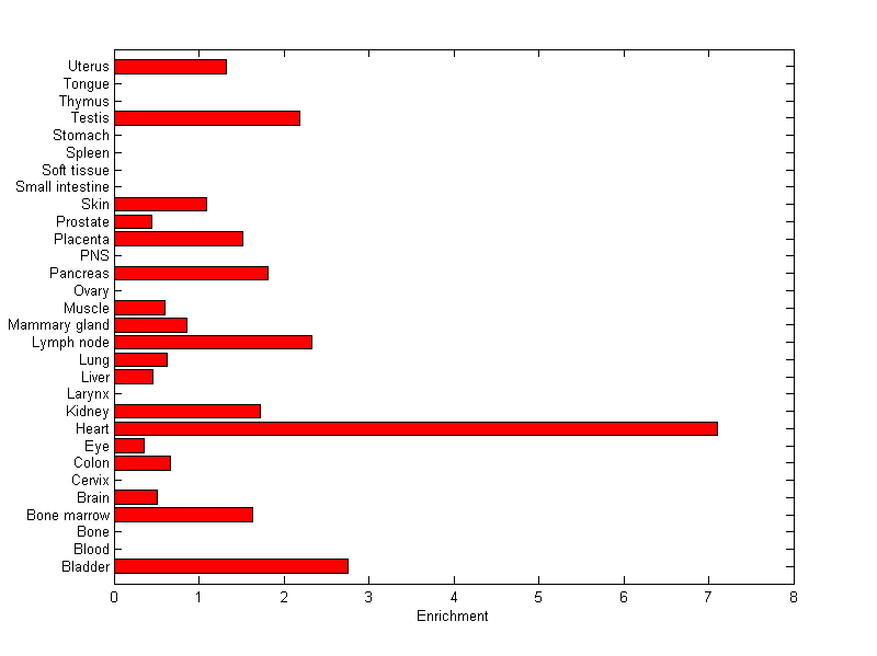The expression level is normalized with tissue-library size. Each value for a gene in a tissue is a ratio of observed ESTs to the expected one in this tissue. The expected number of ESTs is the product of total ESTs of the gene and the fraction of total ESTs in the tissue among all ESTs in 30 tissues.