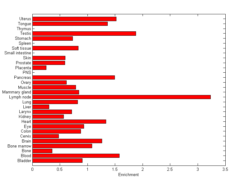 The expression level is normalized with tissue-library size. Each value for a gene in a tissue is a ratio of observed ESTs to the expected one in this tissue. The expected number of ESTs is the product of total ESTs of the gene and the fraction of total ESTs in the tissue among all ESTs in 30 tissues.