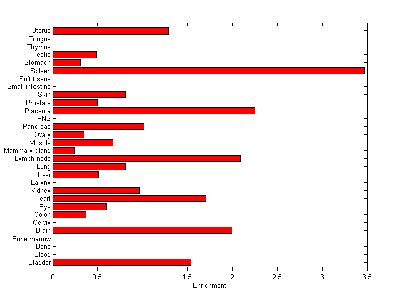 The expression level is normalized with tissue-library size. Each value for a gene in a tissue is a ratio of observed ESTs to the expected one in this tissue. The expected number of ESTs is the product of total ESTs of the gene and the fraction of total ESTs in the tissue among all ESTs in 30 tissues.