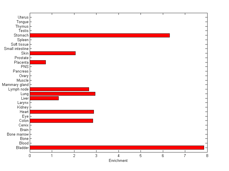 The expression level is normalized with tissue-library size. Each value for a gene in a tissue is a ratio of observed ESTs to the expected one in this tissue. The expected number of ESTs is the product of total ESTs of the gene and the fraction of total ESTs in the tissue among all ESTs in 30 tissues.