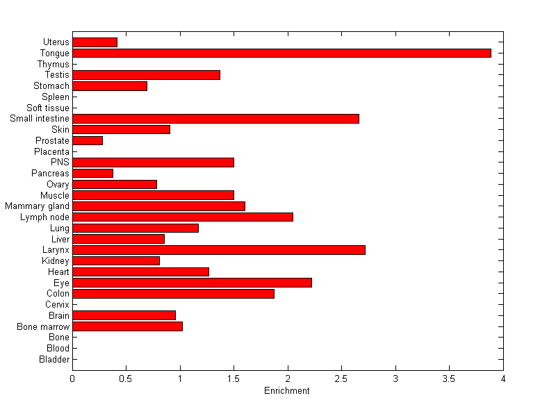 The expression level is normalized with tissue-library size. Each value for a gene in a tissue is a ratio of observed ESTs to the expected one in this tissue. The expected number of ESTs is the product of total ESTs of the gene and the fraction of total ESTs in the tissue among all ESTs in 30 tissues.