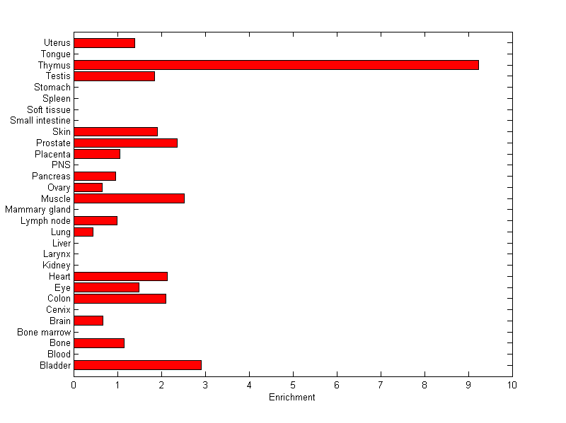 The expression level is normalized with tissue-library size. Each value for a gene in a tissue is a ratio of observed ESTs to the expected one in this tissue. The expected number of ESTs is the product of total ESTs of the gene and the fraction of total ESTs in the tissue among all ESTs in 30 tissues.