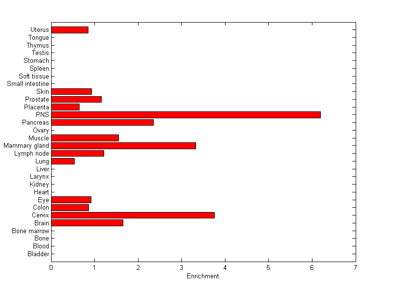 The expression level is normalized with tissue-library size. Each value for a gene in a tissue is a ratio of observed ESTs to the expected one in this tissue. The expected number of ESTs is the product of total ESTs of the gene and the fraction of total ESTs in the tissue among all ESTs in 30 tissues.