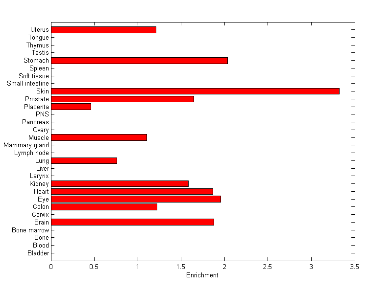 The expression level is normalized with tissue-library size. Each value for a gene in a tissue is a ratio of observed ESTs to the expected one in this tissue. The expected number of ESTs is the product of total ESTs of the gene and the fraction of total ESTs in the tissue among all ESTs in 30 tissues.