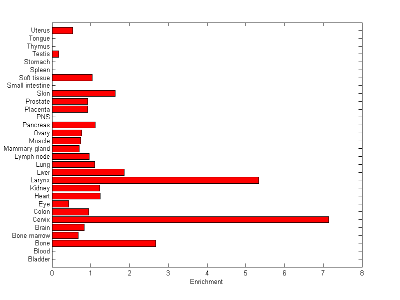 The expression level is normalized with tissue-library size. Each value for a gene in a tissue is a ratio of observed ESTs to the expected one in this tissue. The expected number of ESTs is the product of total ESTs of the gene and the fraction of total ESTs in the tissue among all ESTs in 30 tissues.