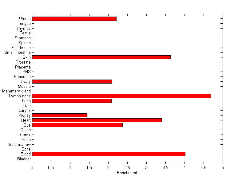 The expression level is normalized with tissue-library size. Each value for a gene in a tissue is a ratio of observed ESTs to the expected one in this tissue. The expected number of ESTs is the product of total ESTs of the gene and the fraction of total ESTs in the tissue among all ESTs in 30 tissues.