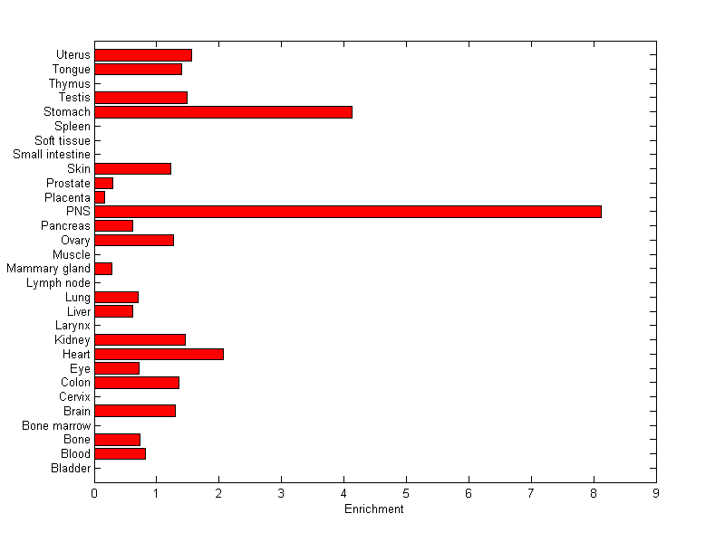 The expression level is normalized with tissue-library size. Each value for a gene in a tissue is a ratio of observed ESTs to the expected one in this tissue. The expected number of ESTs is the product of total ESTs of the gene and the fraction of total ESTs in the tissue among all ESTs in 30 tissues.