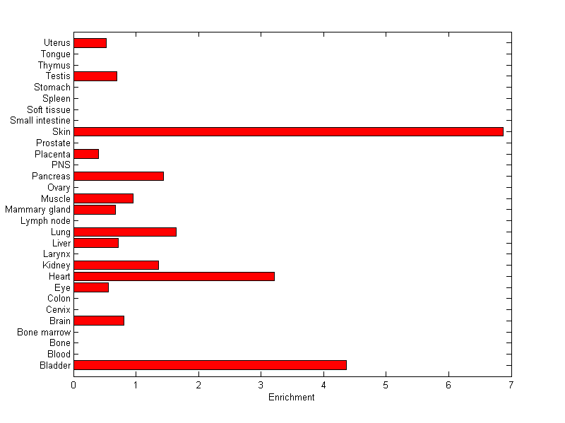 The expression level is normalized with tissue-library size. Each value for a gene in a tissue is a ratio of observed ESTs to the expected one in this tissue. The expected number of ESTs is the product of total ESTs of the gene and the fraction of total ESTs in the tissue among all ESTs in 30 tissues.