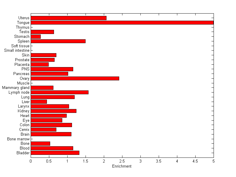 The expression level is normalized with tissue-library size. Each value for a gene in a tissue is a ratio of observed ESTs to the expected one in this tissue. The expected number of ESTs is the product of total ESTs of the gene and the fraction of total ESTs in the tissue among all ESTs in 30 tissues.
