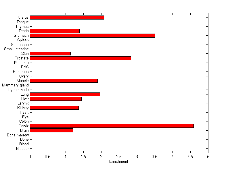 The expression level is normalized with tissue-library size. Each value for a gene in a tissue is a ratio of observed ESTs to the expected one in this tissue. The expected number of ESTs is the product of total ESTs of the gene and the fraction of total ESTs in the tissue among all ESTs in 30 tissues.