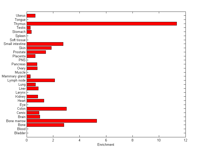 The expression level is normalized with tissue-library size. Each value for a gene in a tissue is a ratio of observed ESTs to the expected one in this tissue. The expected number of ESTs is the product of total ESTs of the gene and the fraction of total ESTs in the tissue among all ESTs in 30 tissues.