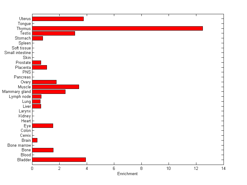 The expression level is normalized with tissue-library size. Each value for a gene in a tissue is a ratio of observed ESTs to the expected one in this tissue. The expected number of ESTs is the product of total ESTs of the gene and the fraction of total ESTs in the tissue among all ESTs in 30 tissues.