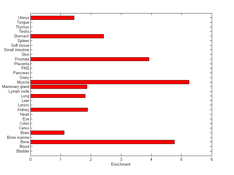 The expression level is normalized with tissue-library size. Each value for a gene in a tissue is a ratio of observed ESTs to the expected one in this tissue. The expected number of ESTs is the product of total ESTs of the gene and the fraction of total ESTs in the tissue among all ESTs in 30 tissues.