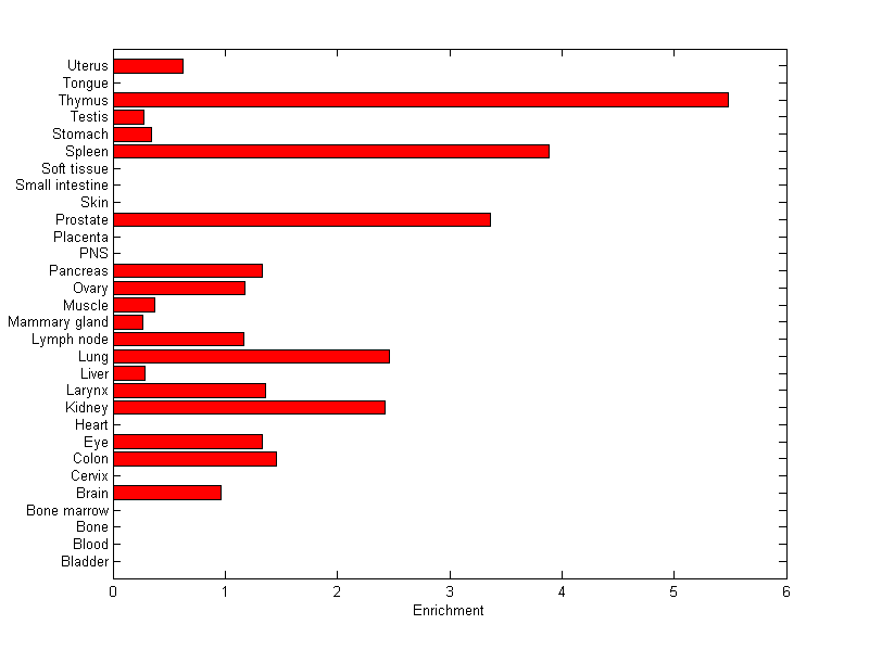 The expression level is normalized with tissue-library size. Each value for a gene in a tissue is a ratio of observed ESTs to the expected one in this tissue. The expected number of ESTs is the product of total ESTs of the gene and the fraction of total ESTs in the tissue among all ESTs in 30 tissues.