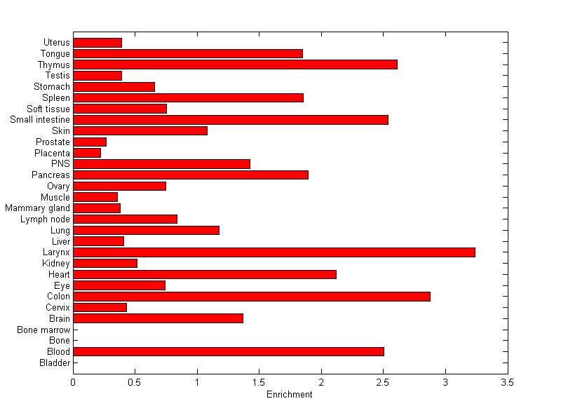 The expression level is normalized with tissue-library size. Each value for a gene in a tissue is a ratio of observed ESTs to the expected one in this tissue. The expected number of ESTs is the product of total ESTs of the gene and the fraction of total ESTs in the tissue among all ESTs in 30 tissues.