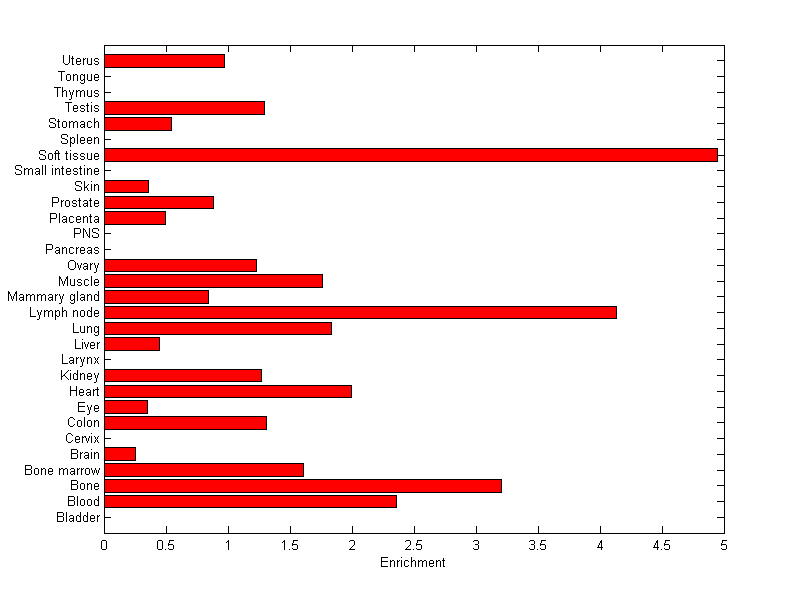 The expression level is normalized with tissue-library size. Each value for a gene in a tissue is a ratio of observed ESTs to the expected one in this tissue. The expected number of ESTs is the product of total ESTs of the gene and the fraction of total ESTs in the tissue among all ESTs in 30 tissues.