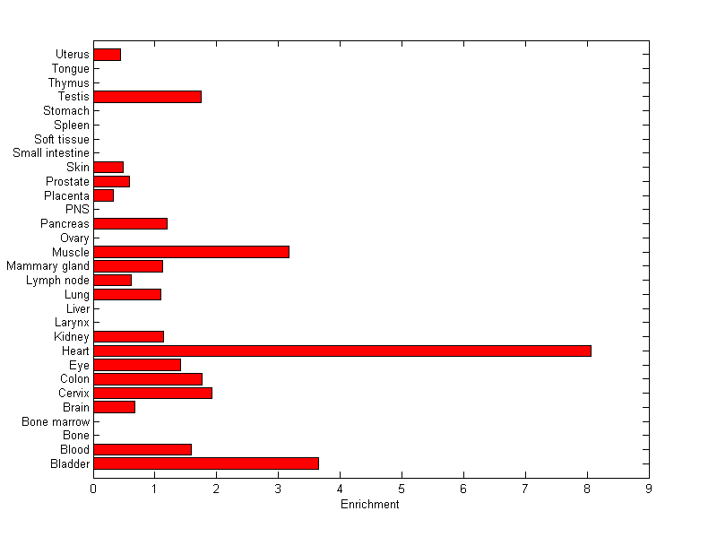 The expression level is normalized with tissue-library size. Each value for a gene in a tissue is a ratio of observed ESTs to the expected one in this tissue. The expected number of ESTs is the product of total ESTs of the gene and the fraction of total ESTs in the tissue among all ESTs in 30 tissues.