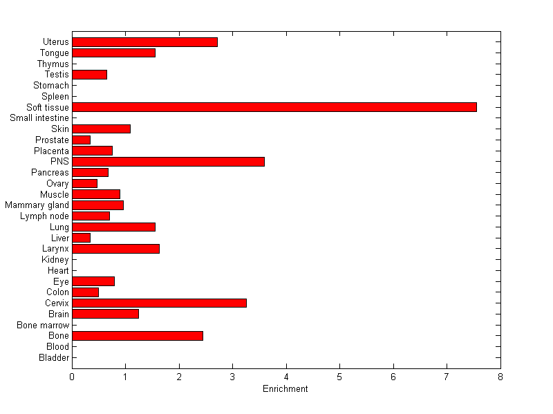 The expression level is normalized with tissue-library size. Each value for a gene in a tissue is a ratio of observed ESTs to the expected one in this tissue. The expected number of ESTs is the product of total ESTs of the gene and the fraction of total ESTs in the tissue among all ESTs in 30 tissues.