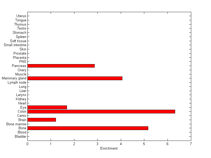 The expression level is normalized with tissue-library size. Each value for a gene in a tissue is a ratio of observed ESTs to the expected one in this tissue. The expected number of ESTs is the product of total ESTs of the gene and the fraction of total ESTs in the tissue among all ESTs in 30 tissues.