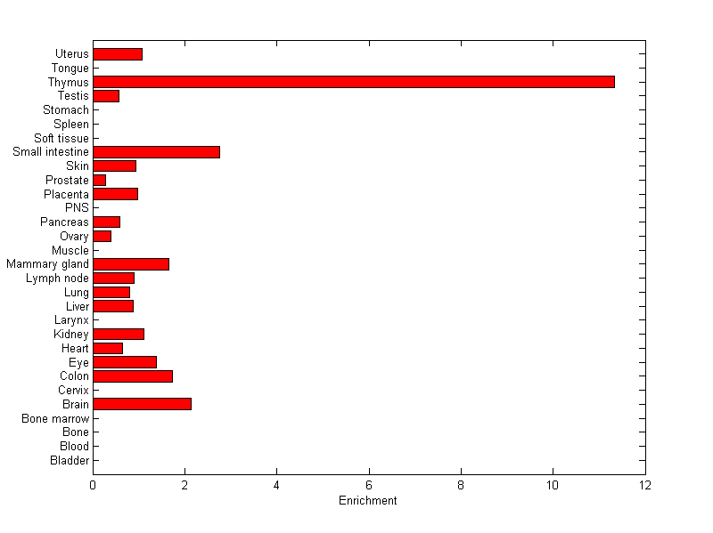 The expression level is normalized with tissue-library size. Each value for a gene in a tissue is a ratio of observed ESTs to the expected one in this tissue. The expected number of ESTs is the product of total ESTs of the gene and the fraction of total ESTs in the tissue among all ESTs in 30 tissues.