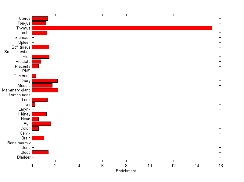 The expression level is normalized with tissue-library size. Each value for a gene in a tissue is a ratio of observed ESTs to the expected one in this tissue. The expected number of ESTs is the product of total ESTs of the gene and the fraction of total ESTs in the tissue among all ESTs in 30 tissues.