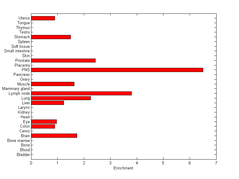 The expression level is normalized with tissue-library size. Each value for a gene in a tissue is a ratio of observed ESTs to the expected one in this tissue. The expected number of ESTs is the product of total ESTs of the gene and the fraction of total ESTs in the tissue among all ESTs in 30 tissues.